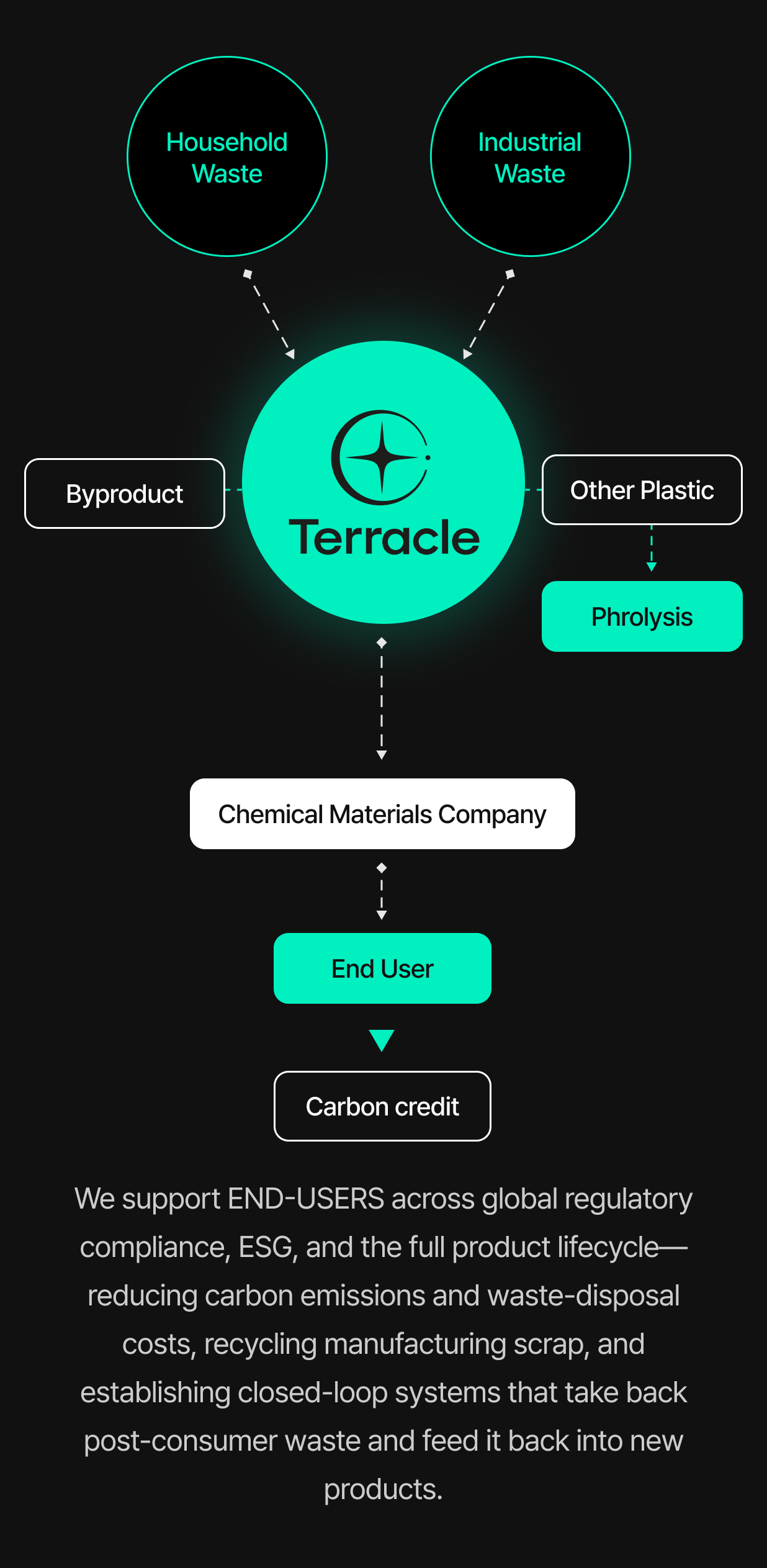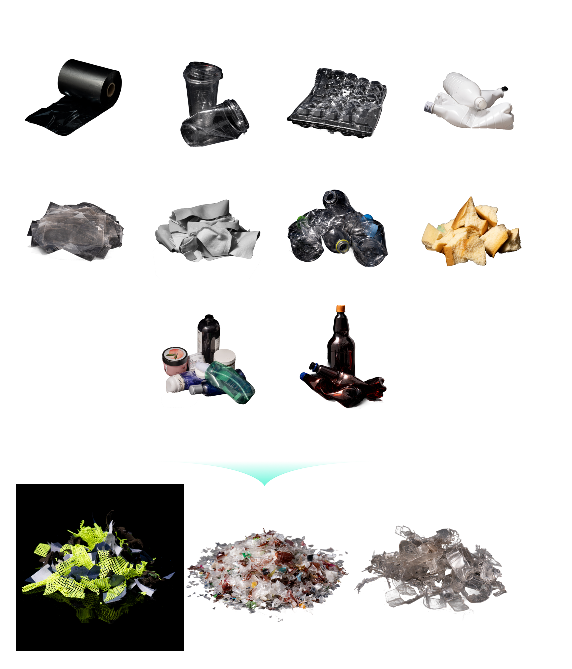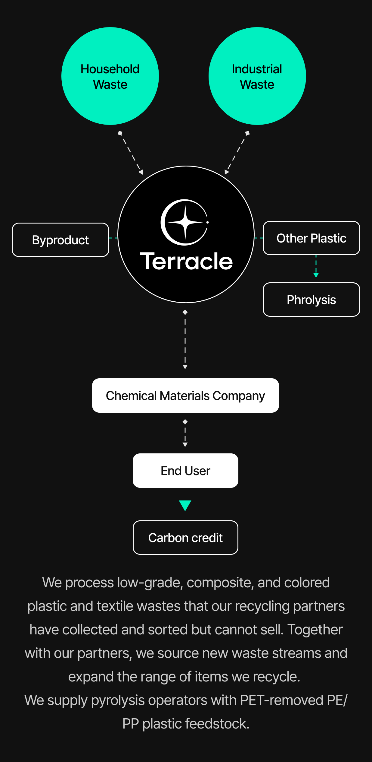 Terracle recycles polyester-based wastes—from colored/composite plastics, textiles, blends, and films to ocean-bound and marine debris—with optional end-to-end processing, and customers can select the specific waste streams they wish to process.